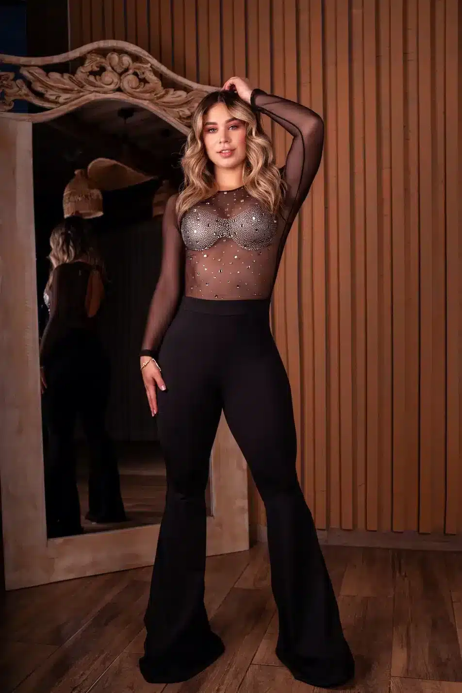 Si estás buscando un enterizo de gala que sea tendencia, el **enterizo largo con cristales** Galaxy Crystal es la elección lógica. Asimismo, la manga larga equilibra la sensualidad del tejido superior, manteniendo la elegancia que caracteriza a nuestra marca. En resumen, este **enterizo largo con cristales** es una declaración de estilo moderno.