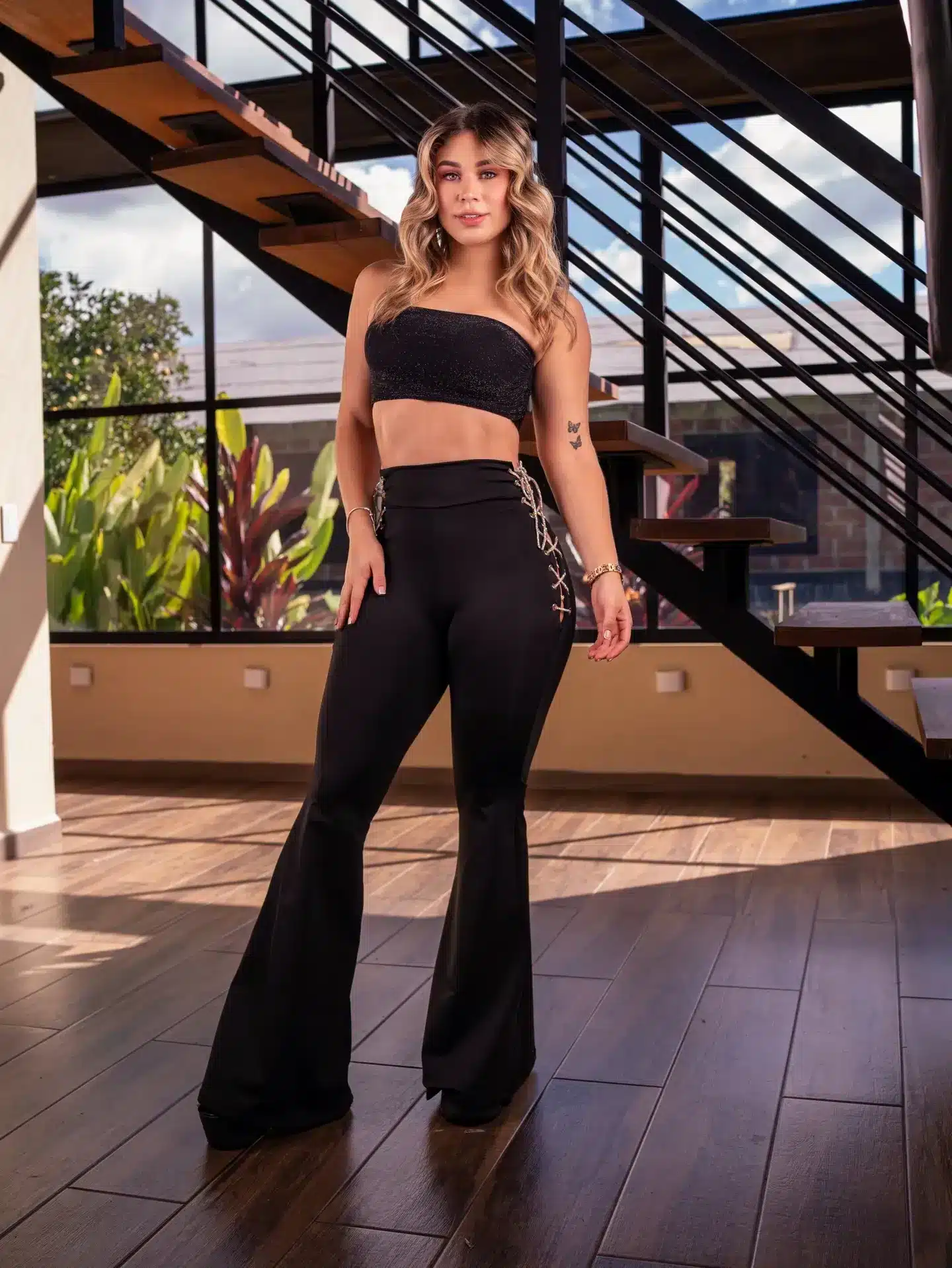 «Tipo de prenda: Diseño de amarre lateral con ojales metálicos tipo corset , talle alto que define la cintura y estiliza la figura, corte campana que alarga visualmente las piernas.